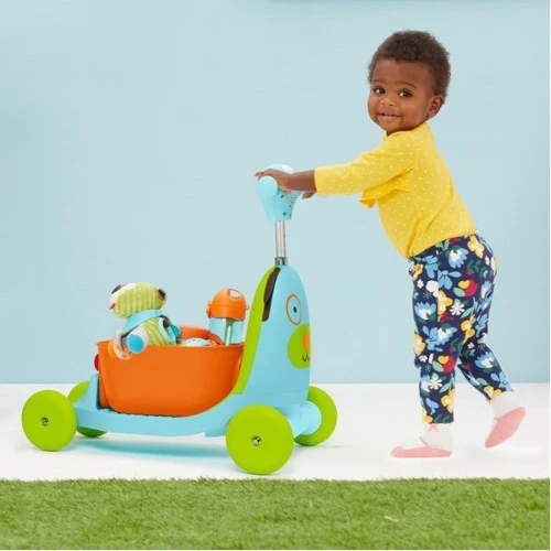 Designed to grow with your little one for three stages of fun, Skip Hop’s cute and colorful Ride-On Toy offers an entertaining way to encourage motor skills development, balance and coordination at playtime. Stage one, designed for early walkers, motivates little ones to push and pull in wagon mode—a great spot for favorite toys, too. At stage two, the wagon’s storage tub converts to a seat for ride-on mode. Ready for stage three? Just remove the seat, pull up the adjustable handle for your toddler, hop on the scooter and take it for a spin! They’ll love pressing the button at the front for a headlight, melodies, a beep sound and more fun sound effects as they whizz along.